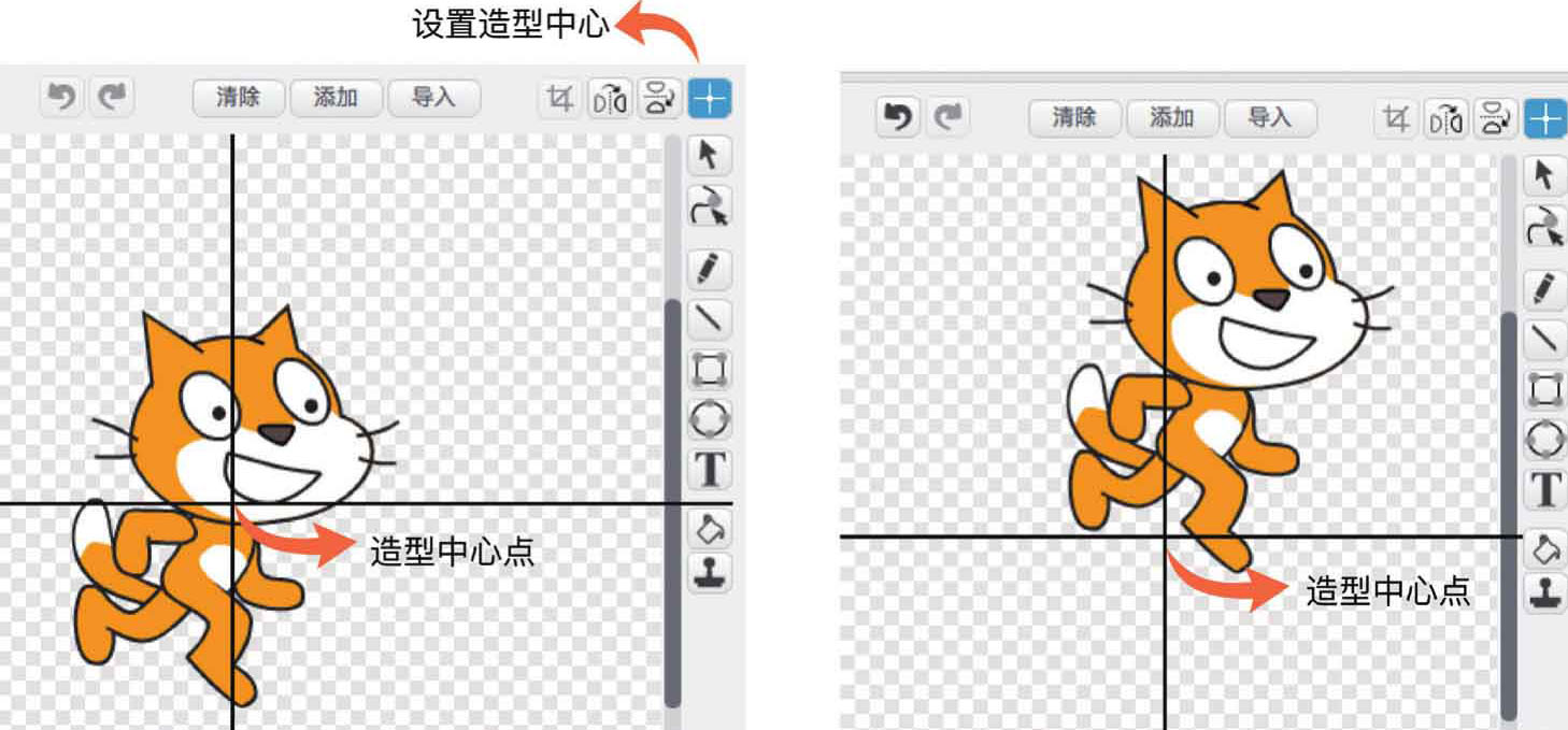 画板软件的右上角有一个工具按钮就是用来指定角色的造型中心的。单击这个工具按钮,画板造型图上随即会出现一个十字交叉坐标线,交叉处即为造型当前的中心点。如果要更改造型的中心点到别处,只需要鼠标单击你希望设置的新中心点即可,或拖曳十字交叉线也可以设置新的中心点。设置后,可再次单击右上角的工具按钮,十字交叉坐标线出现在新的中心点处,以验证新的中心点是否设置成功(请见图2-4)。
