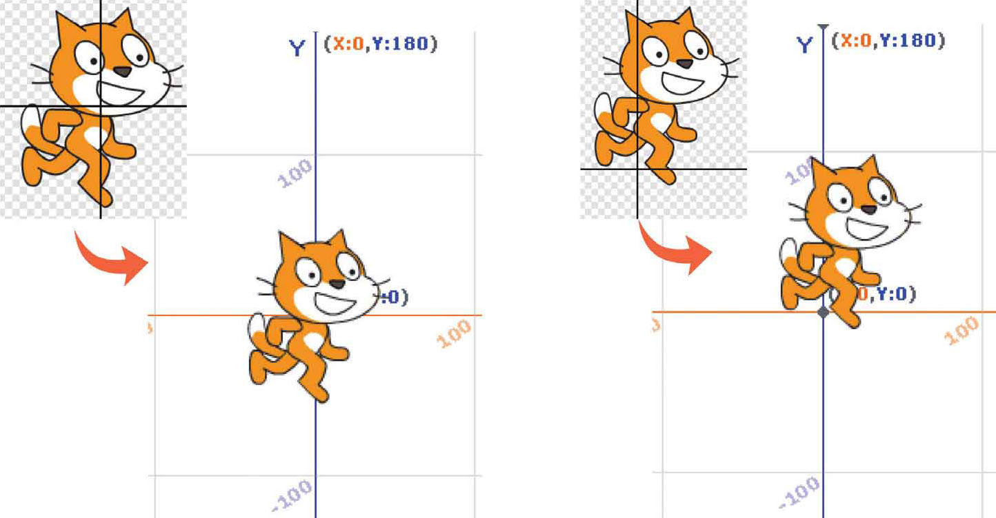 想必还记得第一章运动类指令中学习过的绝对运动和相对运动,编程中我们经常会使用到将角色移动到某个指定的坐标位置,关于坐标系和坐标位置我们也已经很熟悉,但仍有一个问题需要特别留意,就是每一个角色通常它的大小肯定都超过一个像素。这意味着,不管角色身处何地,造型身上所对应的坐标点也将超过一个点,而挪动角色位置时,要到达的目的坐标点只能对应角色身上的某一个点。Scratch就是用角色的中心点来描述角色所在坐标位置。