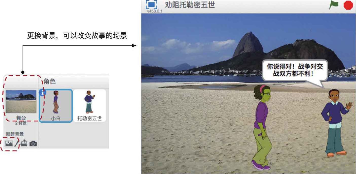 为了让故事更生动更精彩,渲染一下故事所发生的场景也是很重要的。在Scratch中很容易做到,只要更换舞台背景就可以实现。如图2-16所示,我们为本故事从背景库中选取“beach rio”这幅图,这样就变成发生在海滩边上的故事了(请见本书配套例程之【第2章05_劝阻托勒密五世.sb2】)。