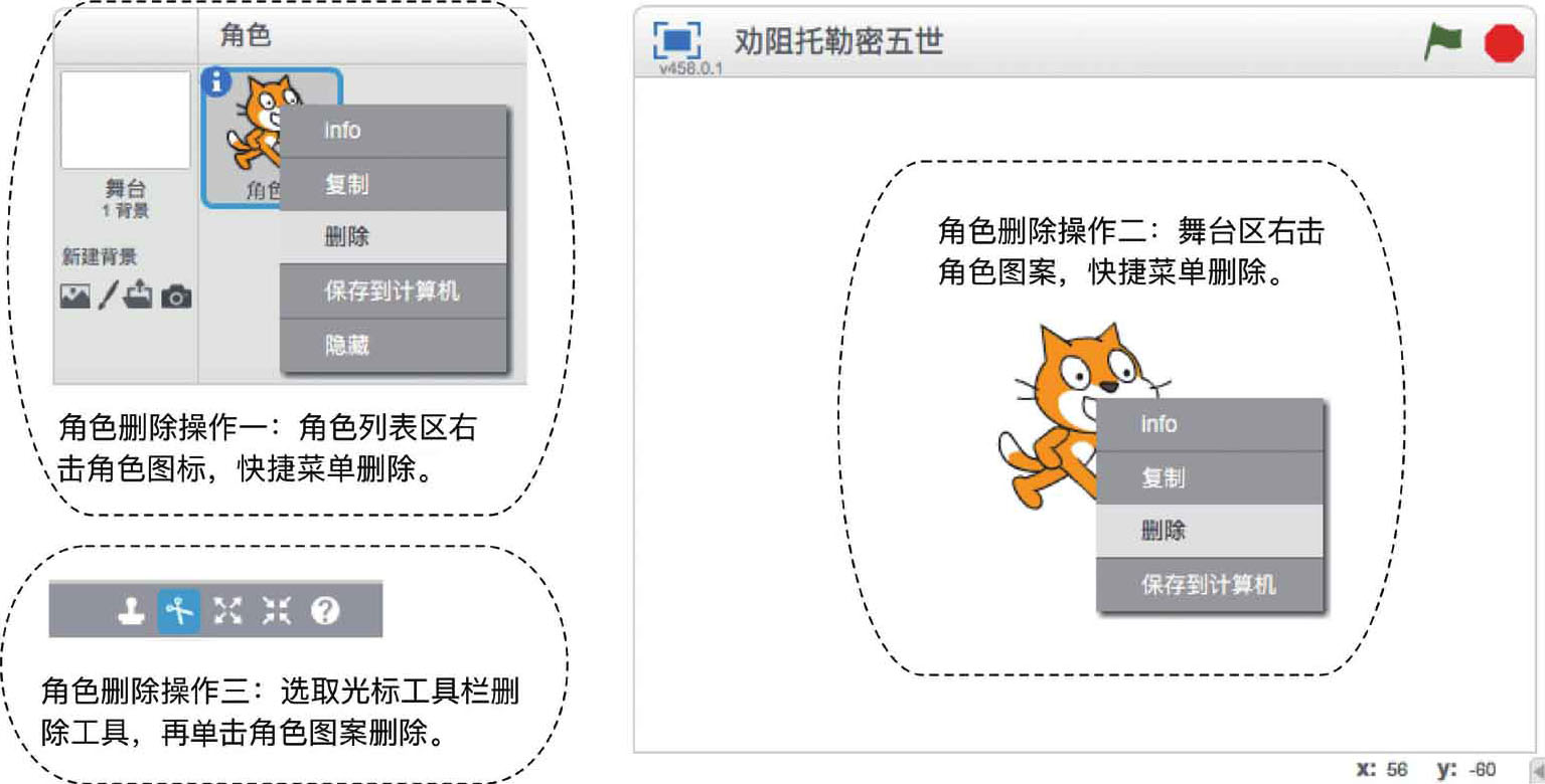 第二步,将新建项目中默认生成的小猫这个角色删除。删除方法有3种:右击角色列表区中角色的图标或右击舞台区中角色图案都会弹出快捷菜单,快捷菜单中选择“删除”即可;还有一个办法是从光标工具栏中选择剪刀形状的图标,然后单击舞台区角色图案(或角色列表区中的角色图标)完成删除。这3种操作方法分别如图2-10所示。