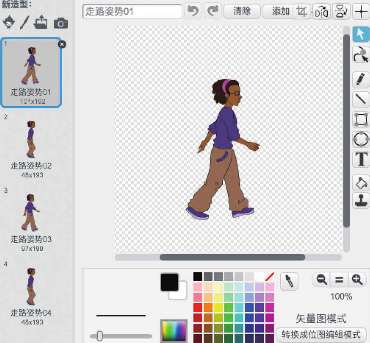 在第1章中我们在“运动”指令中学习了如何使用指令将角色从一个地方移动到另一个地方。但有一个问题,角色始终保持着同一个造型,这样的运动与现实世界很不相符,因此显得不那么真实。本例中,我们将通过为角色增加多个造型,并在运动过程中变换造型,从而大大提升角色运动的逼真效果。图2-13显示,角色“电小白”一共有4个造型,代表着一个人正常走路时的4种姿势。为了模拟真实走路的样子,在角色移动的过程中,同时改变其造型就可以了。