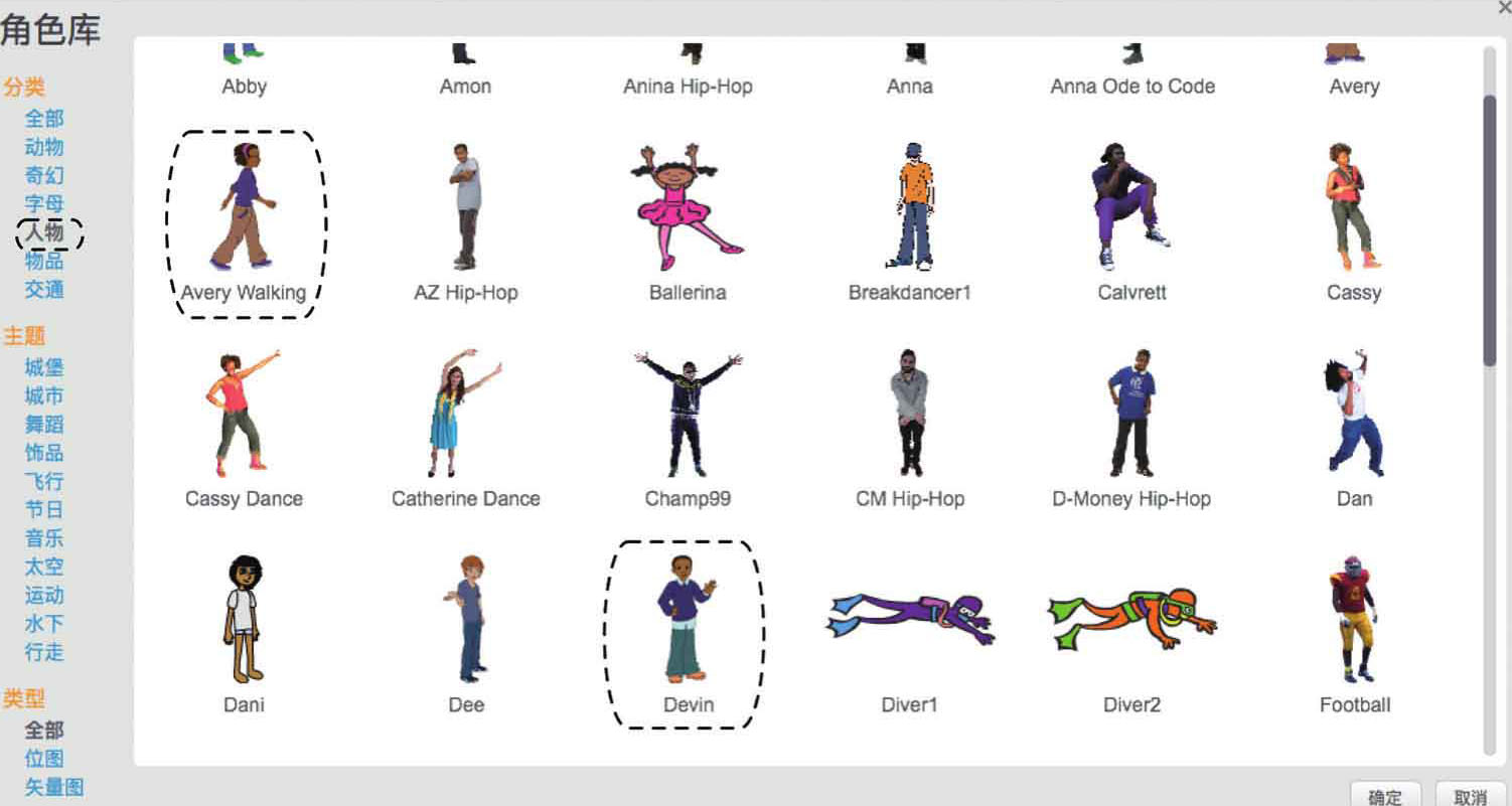 第三步,如图2-11所示,在角色列表区的右上方“新建角色”旁边的第一个图标“从角色库中选取角色”。我们从角色库中找到“Avery Walking”来模拟电小白,Devin模拟托勒密五世。Scratch为便于开发者快速从角色库中找到自己需要的角色,将全部角色进行了分类,如:动画、人物、物品、交通等。此例中用到的角色可以从人物这一分类中快速查找。
