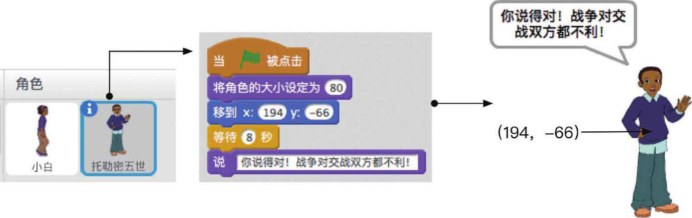 图2-15示意了两个角色之间实现对话的一种方式,这里是通过计算出角色“电小白”的动画总时间,让角色“托勒密五世”等待相应的时间后,再执行“说”指令,由此实现两个角色对话。这是一种暂时的实现办法,在本书的第五章讲述事件类指令时,我们将会学习更巧妙的消息机制方法来实现角色之间的互动。