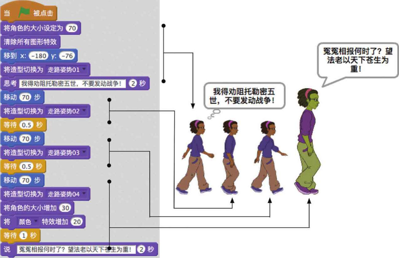 本章前面在学习变换造型的指令时,已经知道可以在脚本程序中通过将造型变换为指定的造型制造出走路的效果,但实际运行前文的例子时,角色运动的速度太快,并不能看到走路的过程,虽然用图章的方式能留下角色每走一步的印迹。