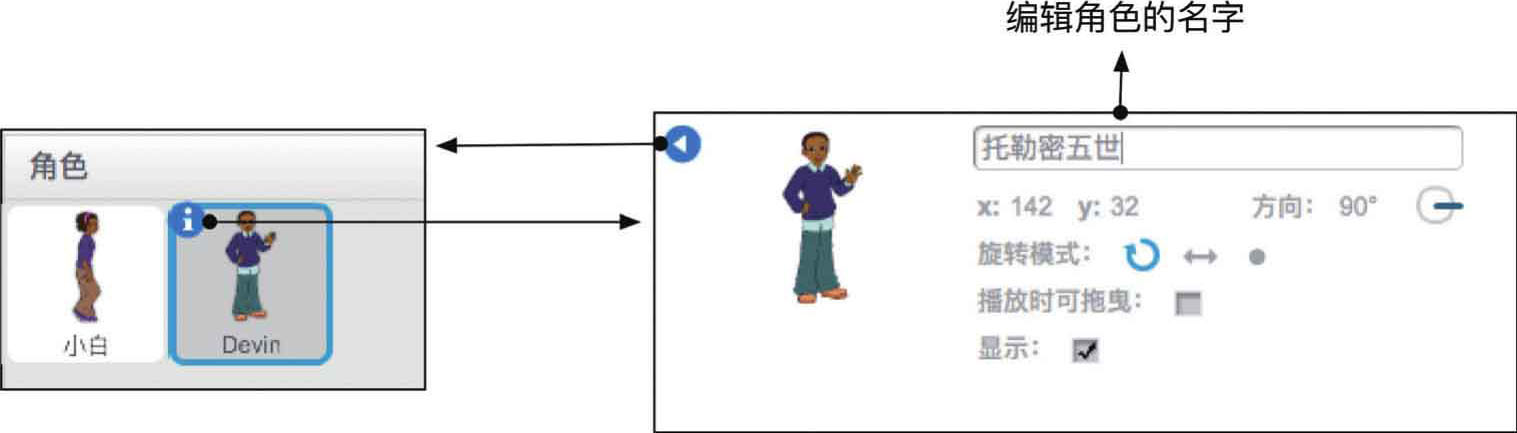 第四步,新建角色成功后,角色列表中就出现了已默认命名的角色,现在需要将角色的名字改成我们希望的样子。具体操作方法:点击角色图标左上角的“i”图标,将出现图2-12右半部分所示的界面,即角色属性界面,在文本框中编辑名字即可,然后按左上角的箭头键可以返回到前一界面。另外,这个属性界面,还可以设置角色的朝向、角色的旋转模式、播放时是否可以拖曳以及程序刚开始运行时是否显示等属性,有些属性也可以通过指令在程序运行过程中设置(例如:面向、显示/隐藏、旋转模式),而角色的名字和播放时是否可以拖曳这两个属性必须在属性界面上完成设置。
