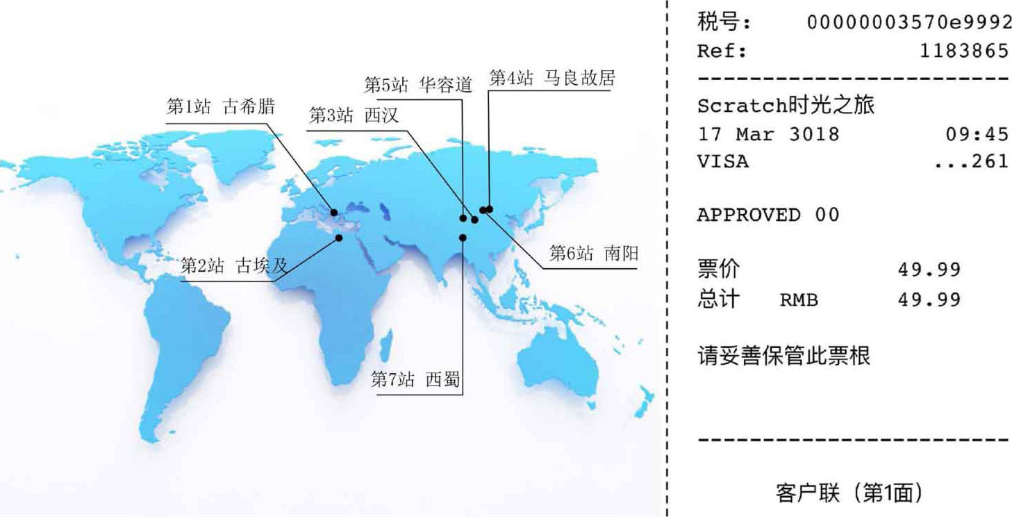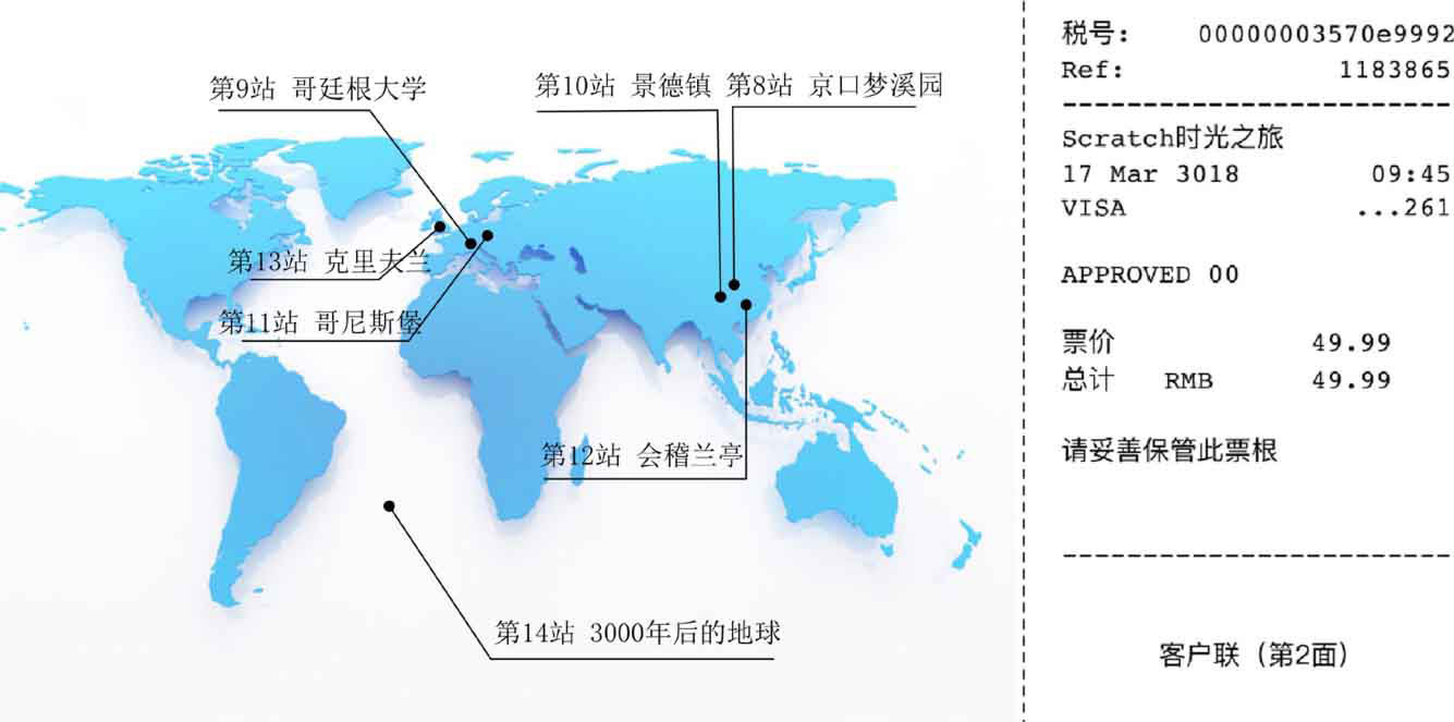 这样吧,我送你一张以“Scratch编程”为主题的时光旅行票。你可以到达14个时光站点,也有机会完成14项Scratch编程任务,旅程结束后你就有希望成为Scratch编程高手了!