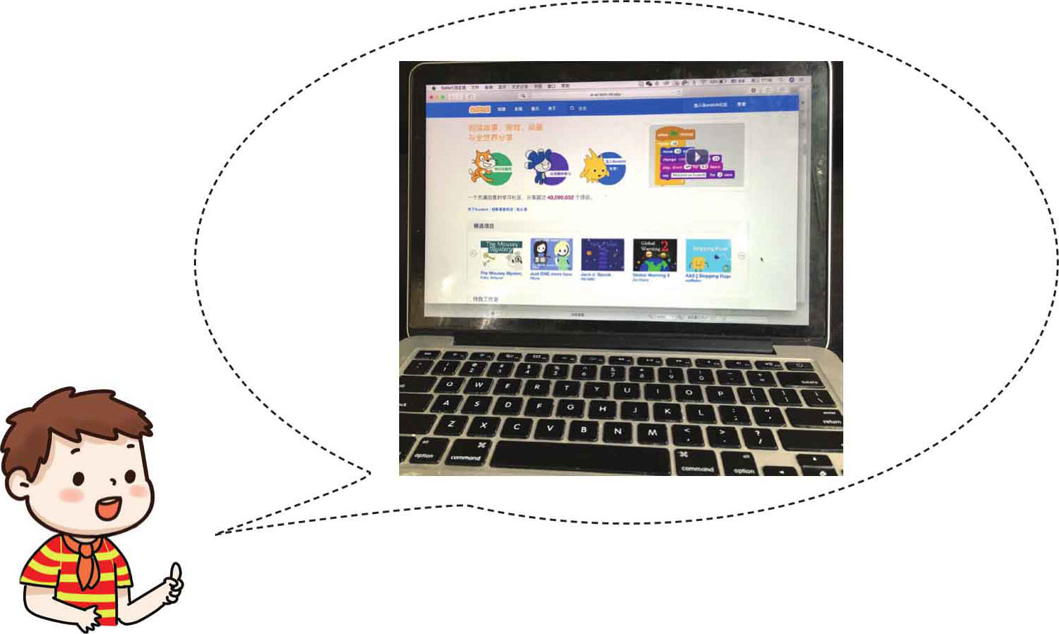 如果你也要出发,请检查一下自己的电脑上Scratch2.0开发环境是否已经安装好。如果不确定,请到本书的附录A中查看安装Scratch2.0的方法,并熟悉一下操作界面哦!