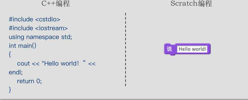 在Scratch出现之前,编写程序基本上是通过键盘输入文字代码,然后由编程软件编译或解释成机器语言;而Scratch提供的指令都是图形化的积木方块,我们只需按一定的规则“搭建”积木就可以了。例如,要在屏幕上打印“Hello world!”这个字符串,C++编程需要输入大段的文本代码,Scratch只需要放置积木。