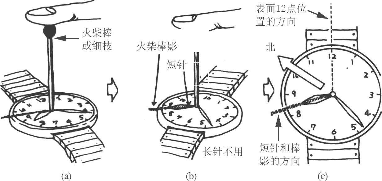 (1)将手表摆平,中央立一火柴棒(小树枝亦可,图1.7(a));