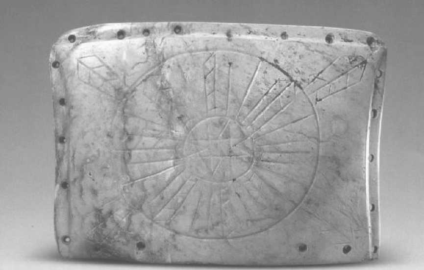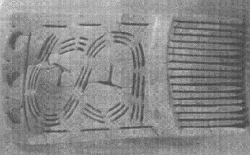 从考古上看,华夏先祖早在5000年前就已经掌握圭表测量的技术,安徽含山一距今5600年至5300年的考古遗址中所发现的一块玉制龟板上就有表示土圭测日的痕迹,如图1.15所示。