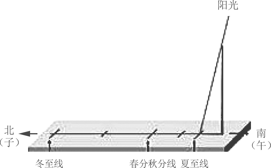 在掌握了“圭表法”计日后,人们自然会因为杆影长度的几个特征数值而注意到一年中四个特殊的日子——冬至、夏至、春分、秋分。而这四个日子在圭表上则反映为三道被着重标记的刻线:冬至点标线离测杆基点最远,夏至最近,春分和秋分时标线到基点的距离等于测杆长度,如图1.13所示。