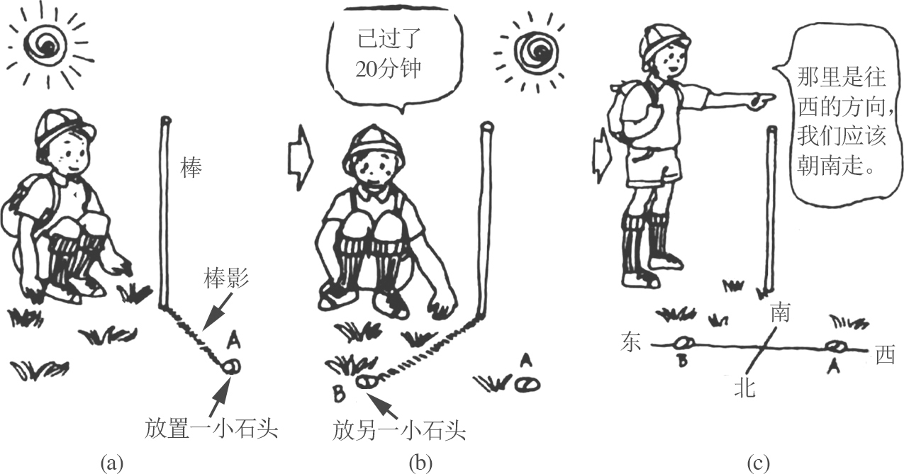 图1.8 使用木棒、小石头,利用太阳阴影的移动测定方向