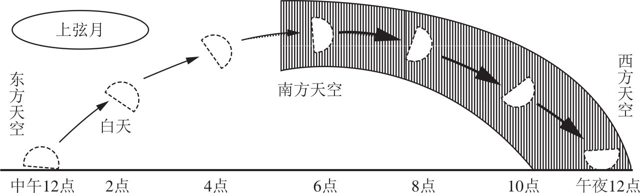 图1.9 上弦月黄昏时由南方天空升起,深夜则沉没于西方地平线