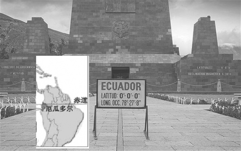厄瓜多尔位于南美洲西北部,赤道横贯国境北部,厄瓜多尔就是西班牙语“赤道”的意思。厄瓜多尔一家名为“世界中心”的主题公园自称位于赤道上,而经全球卫星定位系统(the Global Positioning System,GPS)测定,根本不是那么回事。这家主题公园自己画的0°-0'-0"纬度线并不是真正的赤道(图1.25),而是偏北了240米。对此,公园官方解释说,位于公园内的赤道纪念碑修建于1936年,那时的定位技术不像现在这么精准。据悉,这家公园为国家所有,每年能够吸引大约50万名来自全球各地的游客。有趣的是,前往参观真正赤道线所在地的游客却少于前往主题公园的游客人数。