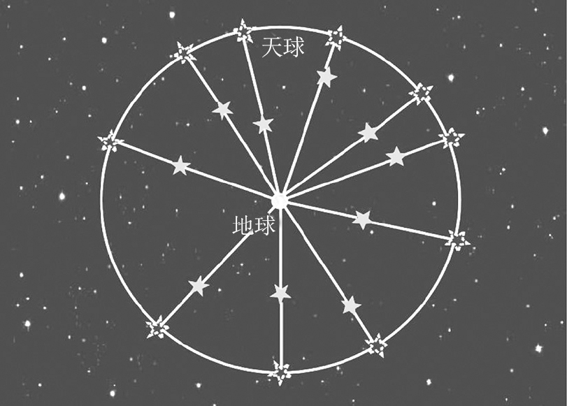 图1.28 天球的半径是任意的,所有天体,不论多远,都可以在天球上有它们的投影。这里显示的是地心天球,主要用来研究天体的视运动。替代地球,以太阳为中心的天球叫日心天球,主要用来进行天体运动研究的动力学计算
