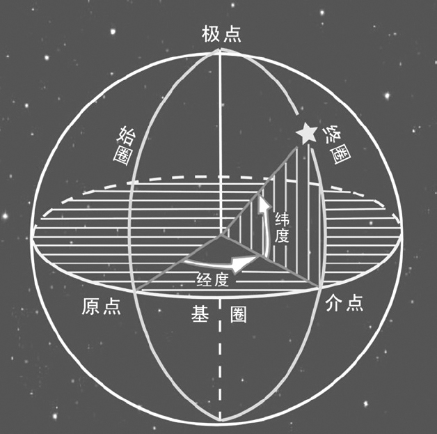 天球是一个球形,所以天文坐标系都属于球坐标系。球坐标系的一般模式是以基圈、始圈和终圈构成一球面三角形。纵坐标即纬度;横坐标即经度(图1.34)。
