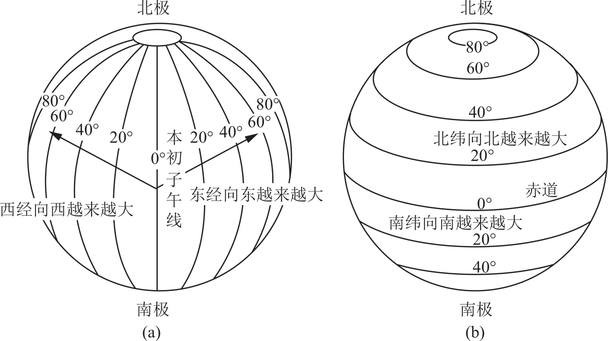 图1.23 经度从本初子午线开始向东、向西各180°记数(a);纬度从赤道开始向北、向南各90°记数(b)