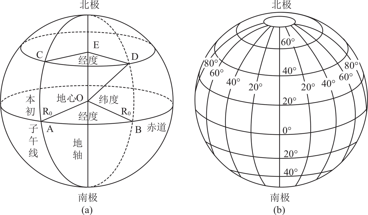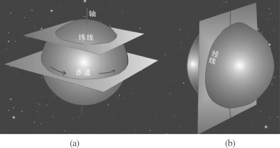 经线(子午线): 通过地轴的平面同地球相割而成的圆(图1.21(b))。经线都是大圆的一半,都在两极相交,大小相同。