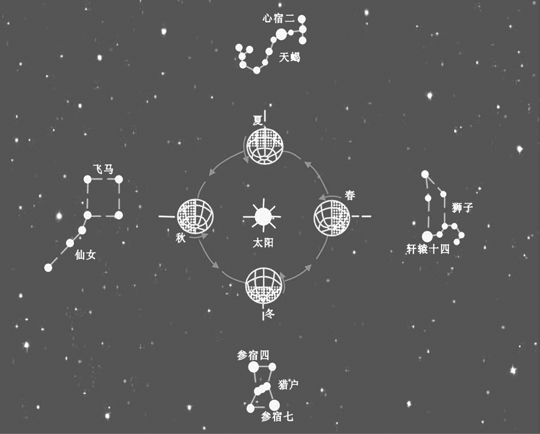 图1.31 由于地球绕太阳公转造成的太阳周年视运动而产生的四季星空更替的现象(图中对应的是观察者当地时间晚上8时左右的星空),这一现象也可以由地球的自转产生,只不过地球自转的24小时中,有12个小时星空被太阳的光芒所覆盖了