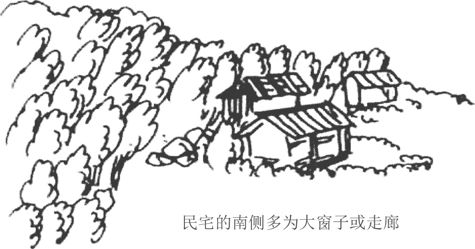 图1.6 山上的民宅(尤其是庙宇)多为坐北朝南的建筑,并且会在北侧种植树木以防止寒冷的北风,依此原则也可判别出南北