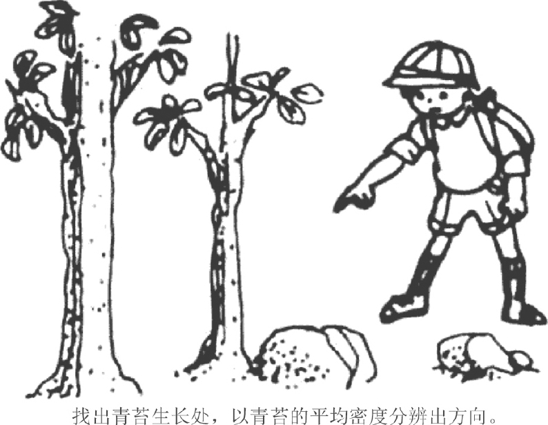 (4)由石头或树根的青苔辨别(图1.4)