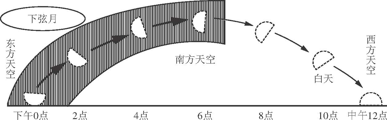 图1.11 下弦月深夜时由东方地平线升起,清晨则位于南方天空上