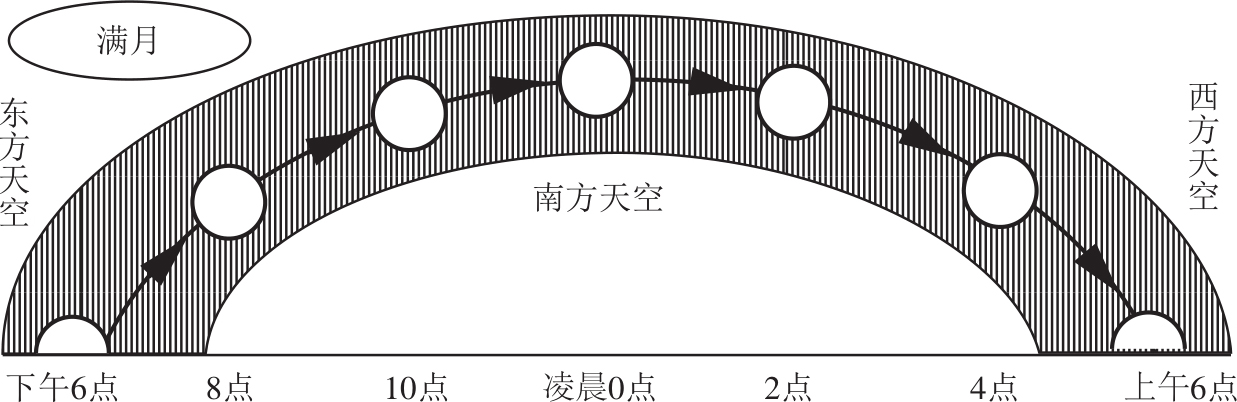 图1.10 满月黄昏时由东方地平线升起,清晨则沉没于西方地平线