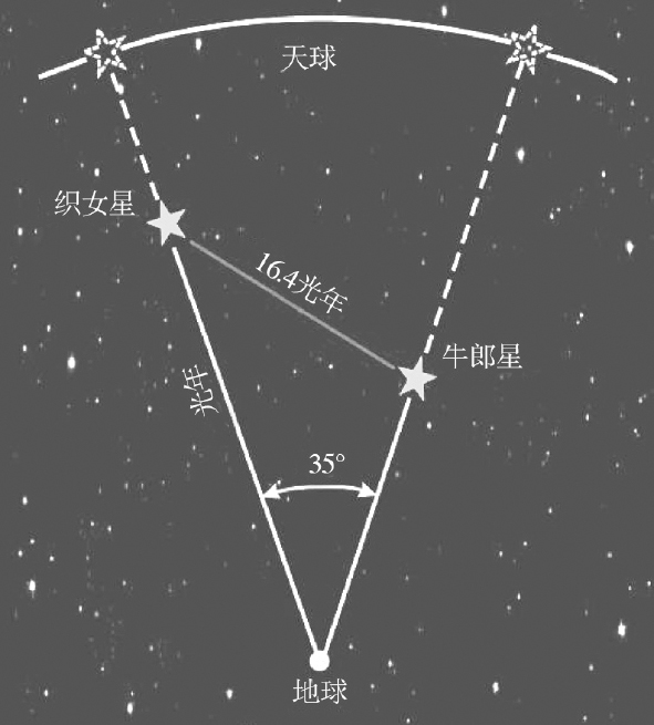 图1.33 最著名的“鹊桥会”,两个主角牛郎织女的实际距离是16.4光年,而我们在天球上看去,它们的角距离是35°