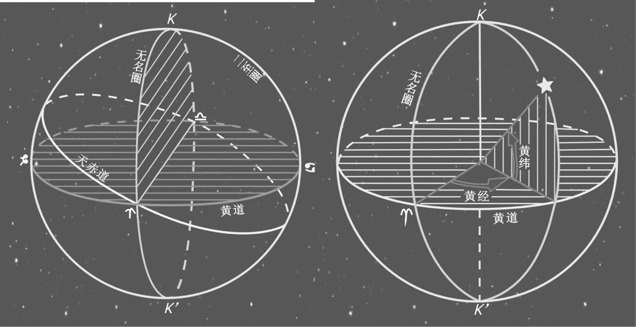 基本圈: 黄道、无名圈(通过春分点的黄经圈)和二至圈;