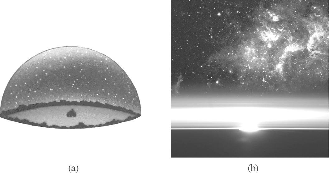 图1.27 在我们头顶上像一个“锅盖”一样的“天穹”(a)和黎明时在天际边的“地平线”(b)