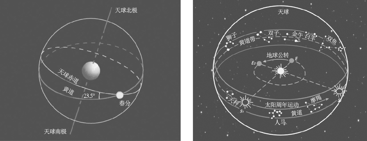 天体除去“周日视运动”,还参与“周年运动”。比如太阳的周年运动(图1.30)方向是自西向东,与地球公转方向相同。太阳“周年视运动”的视行路线被称为黄道。天体的“周年运动”还会产生星空的季节变化(图1.31)。