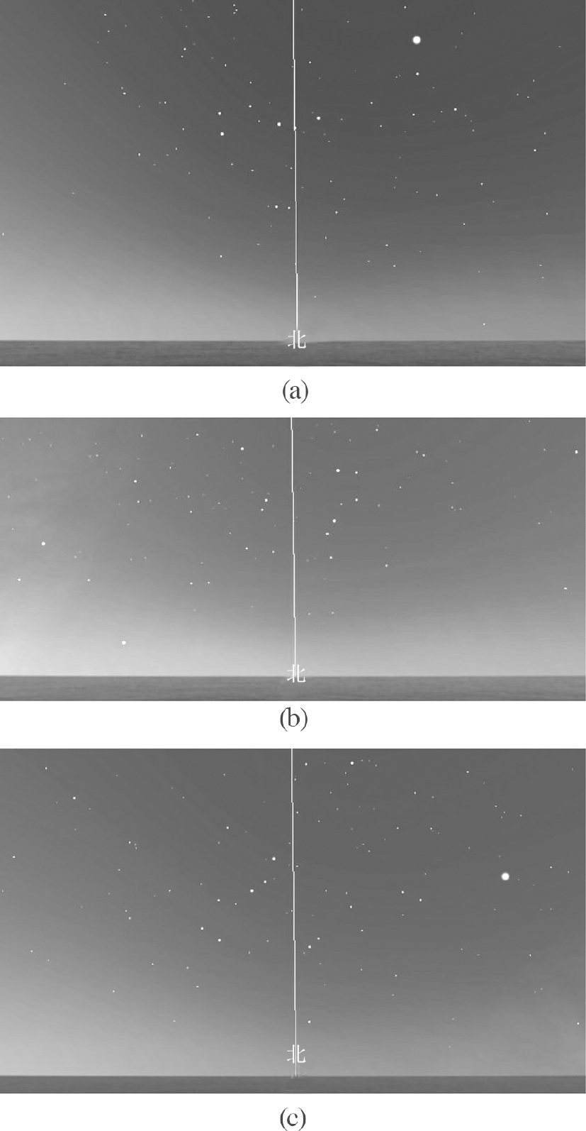 图1.19 同样是计算机模拟的3000年前我国战国时期黄昏时刻天空中北斗七星的形态,春季指东(a)、夏冬则指向南北(b)、(c)