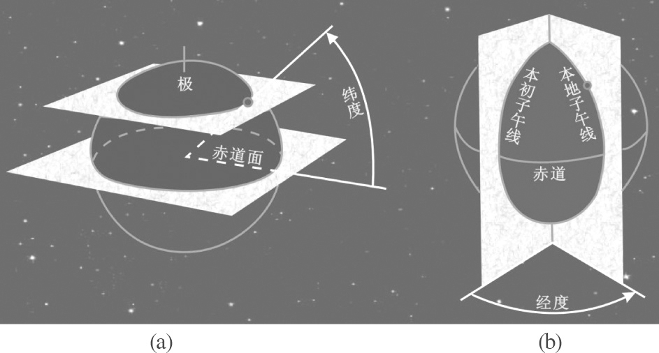 图1.22 经度就是某地经线到本初子午线的角度(b);纬度则是经过某地的纬线的那个小圆与赤道面的夹角(a)
