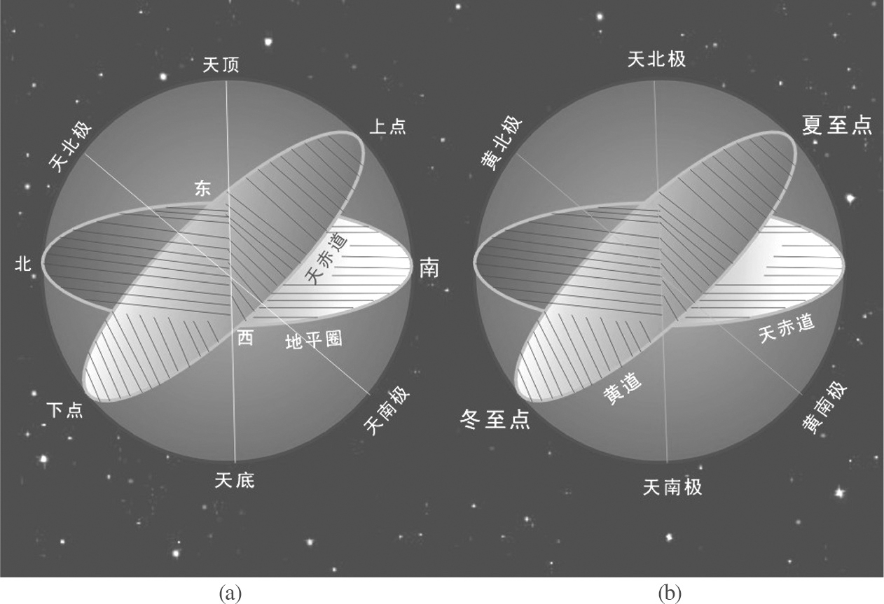 图1.32 天球上根据天文坐标系的需要而设置的基本圈和基本点。(a)地平圈与天赤道的交点(东、西)和远距点(南、北、上点、下点);(b)黄道与天赤道的交点(春分秋分)和远距点(夏至冬至点和黄道起始点)