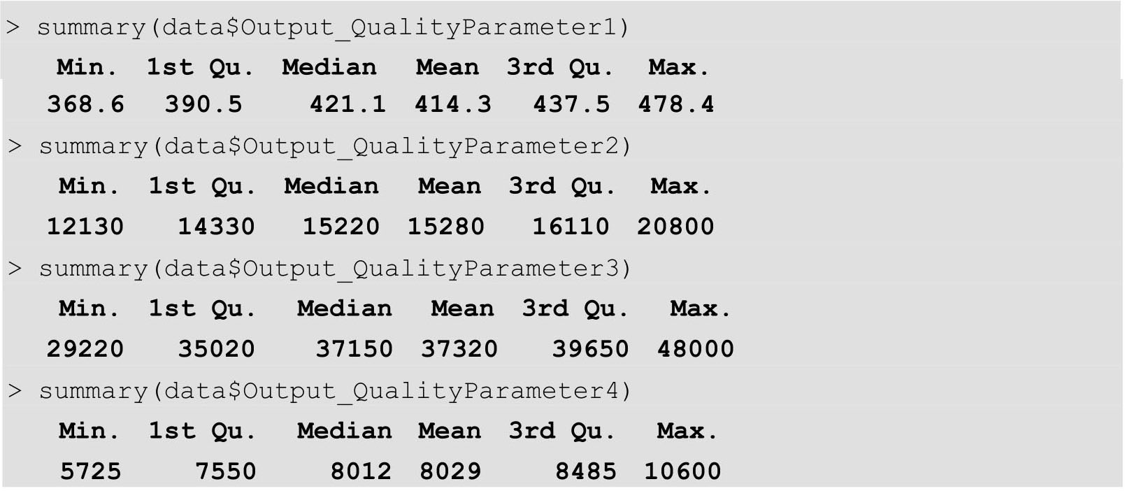 如上所示,全部4个参数在范围、数值和分布方面完全不同。Output Quality Parameter 1(成品质量参数1)的数值大部分落在350~500,而Output Quality Parameter 2(成品质量参数2)的范围则是从12000到25000不等,其他参数依此类推。