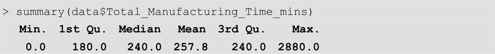 从加工时间的分布来看,很容易地发现异常值(第三四分位数与最大值之间的巨大差值),因此需要分别处理。可能有一些异常数据点的加工时间为0。