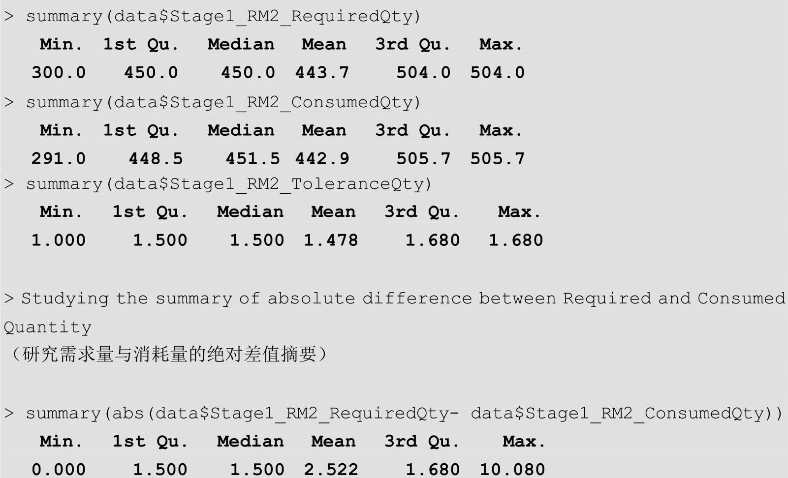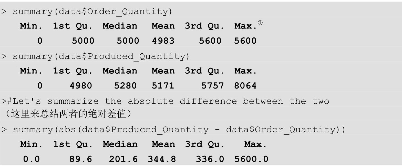 上述代码给出了Order_Quantity、Produced_Quantity的摘要(即分位数分布)信息,以及这两者绝对差值。在大多数情况下,order_quantity订单需求量大约是5000千克(请参阅order_quantity摘要中的中位数),但是生产量处处相差很小。生产量和需求量的绝对差值摘要显示为一个平均数,约为345,而中位数即第50百分位数则约为200,这表明在大多数情况下,需求量和生产量之间肯定存在差异。