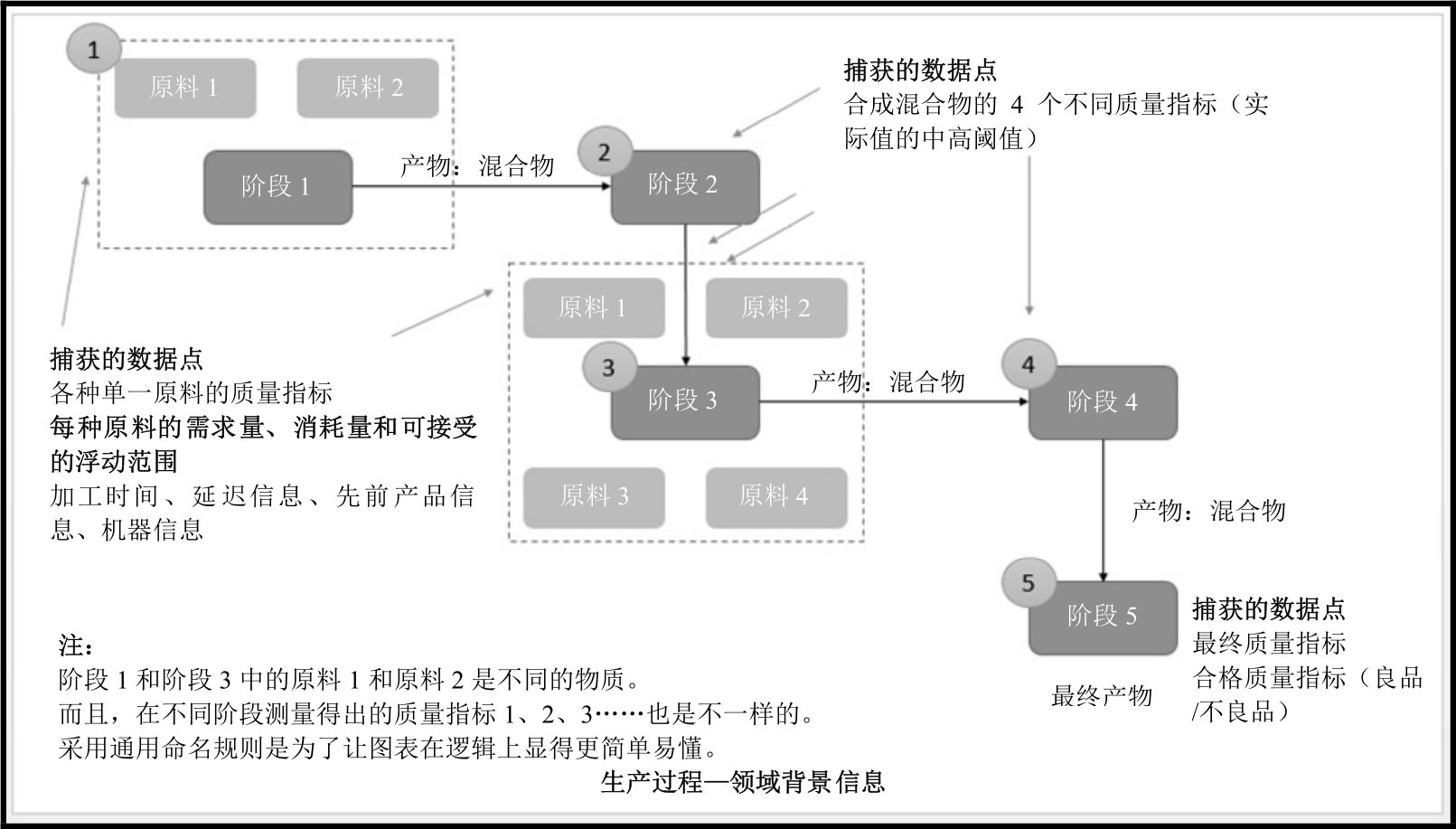 提供所用原料、生产过程之前的质量参数以及中间质量参数的详细信息。假设在第一阶段,两种原料混合并加工形成一种混合物料,然后将混合物料与一种或两种其他新原料一起传送到第二阶段。接着,在生产过程之前对每种单一原料检测并记录质量参数,同样地每个阶段混合物料后也需如此。另外,还记录了各个生产阶段所需原料的数量/比例和原料的实际消耗量。