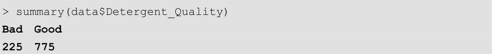 最后的一个列为Detergent_Quality(即洗涤剂质量),它指明生产出来的产品的质量最终为Good Quality(良品)或Bad Quality(不良品)。这个数据维度对即将进行的分析大有帮助。以下代码显示了该列的摘要。可以看到,大约20%的产品因为属于不良品而被视为不合格产品。