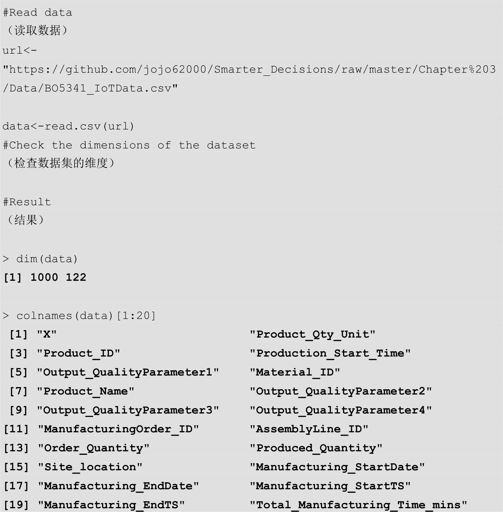 接着来查看这些数据,探索可用的数据源,查验数据的可用程度。这些数据提供了1000条记录,代表了1000个生产过程。每一行的数据对应一个生产订单,为一个完整的批次数据。在洗涤剂生产行业中,最终产品都是批量生产,后来再分成小包装。一个生产订单/批次可能有1000千克的洗涤剂或甚至更多。整个批次用一行数据来表示,提供生产过程所有数据维度的信息。