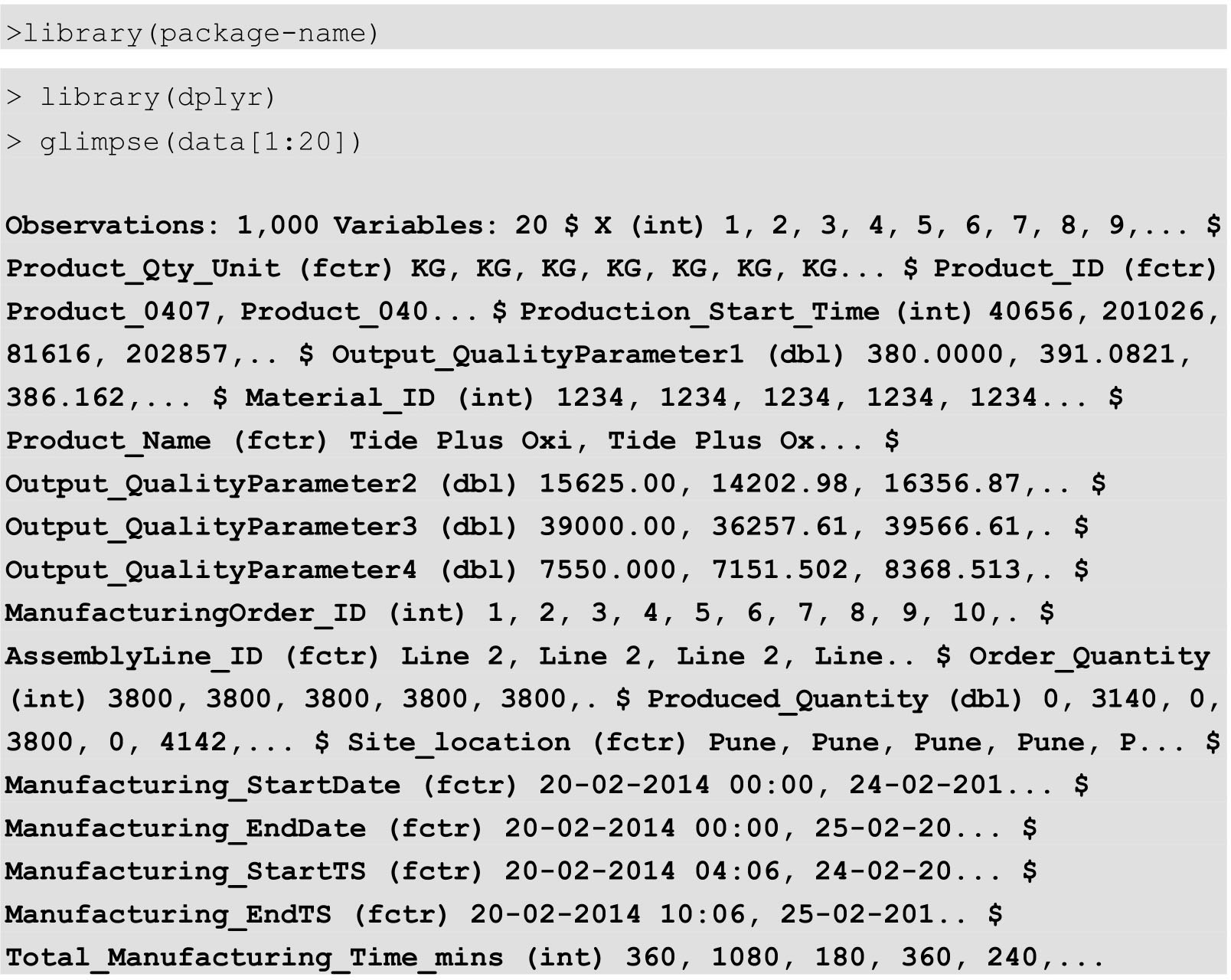 接着将在R语言中选用一个名为dplyr的特殊软件包,毫不费力地完成这些数据工程步骤。dplyr软件包中的glimpse命令可帮助深入查看数据集。在这里开始探索前20列的内容,努力地将数据理解透彻。