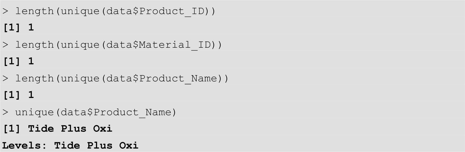 Product_ID和Material_ID是工厂生产的每个产品的唯一标识,可查看数据集里不同数量的产品。但是,在本用例的数据集里只有一种材料和一种产品的数据。假设产品是Apple iPhone 6S,材料是iPhone 6S 64 GB。在本用例中,材料Tide Plus Oxi是产品汰渍的一种洗衣粉变体。以下代码可探查数据中Product_ID和Material_ID的不同计数,并可查看相应的值: