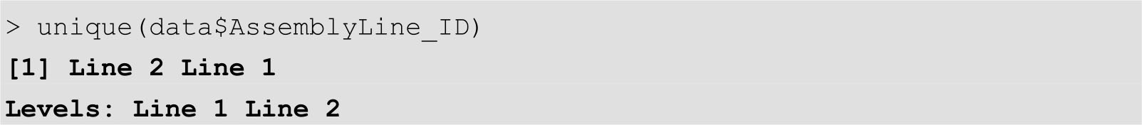 AssemblyLine_ID(即生产线ID)表示在哪条生产线上生产的产品。一般而言,在任何一个生产车间里,都会有多条生产多种产品的生产线。在这里,从下面代码可看到,有两条用于生产的不同生产线,即Line 1和Line 2: