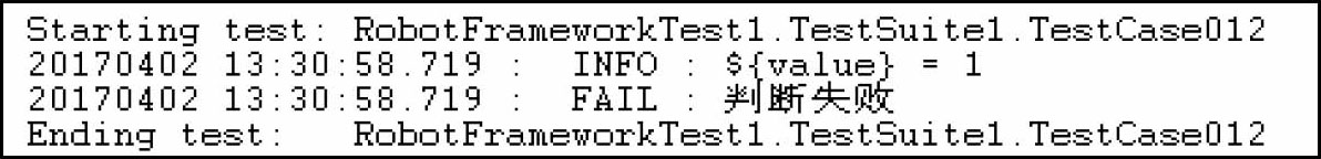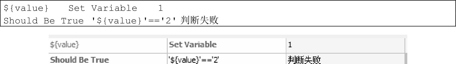 Should Be True关键字用来判断返回值是否为True,例如我们将变量${value}的值同样设置为1,使用Should Be True关键字对表达式'${value}'=='2' 进行True和False的判断,由于我们设置的值为1,因此很明显会判断失败,如图1-3-3所示。
