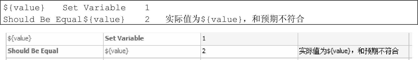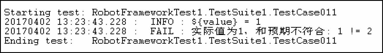 Should Be Equal关键字一般用来判断实际结果是否和预期结果相等。例如,我们将变量${value}的值设置为1,使用Should Be Equal关键字来判断${value}是否等于2,若断言失败,则输出实际值为${value},和预期不符合,如图1-3-1所示。