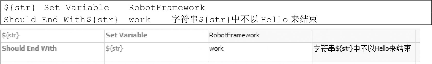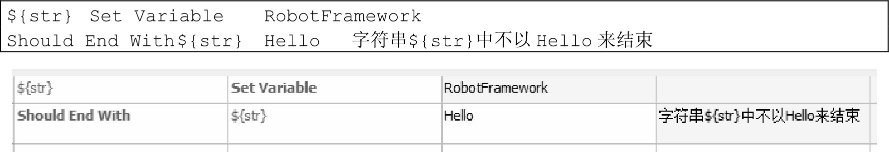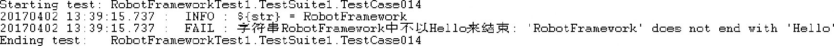 Should End With关键字用来判断某个字符串是否以我们预期指定的字符串来结束,例如我们同样将变量${str}的值设置为RobotFramework,使用Should End With来判断${str}是不是以“Hello”这个字符串来结束。很明显,我们执行的结果肯定会失败,如图1-3-7所示。