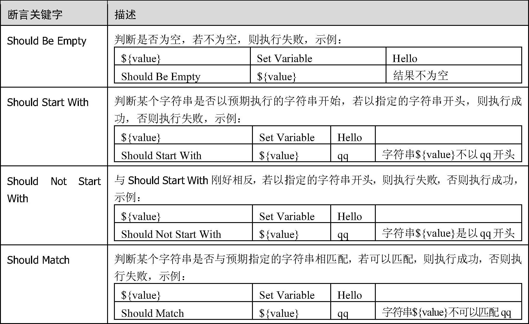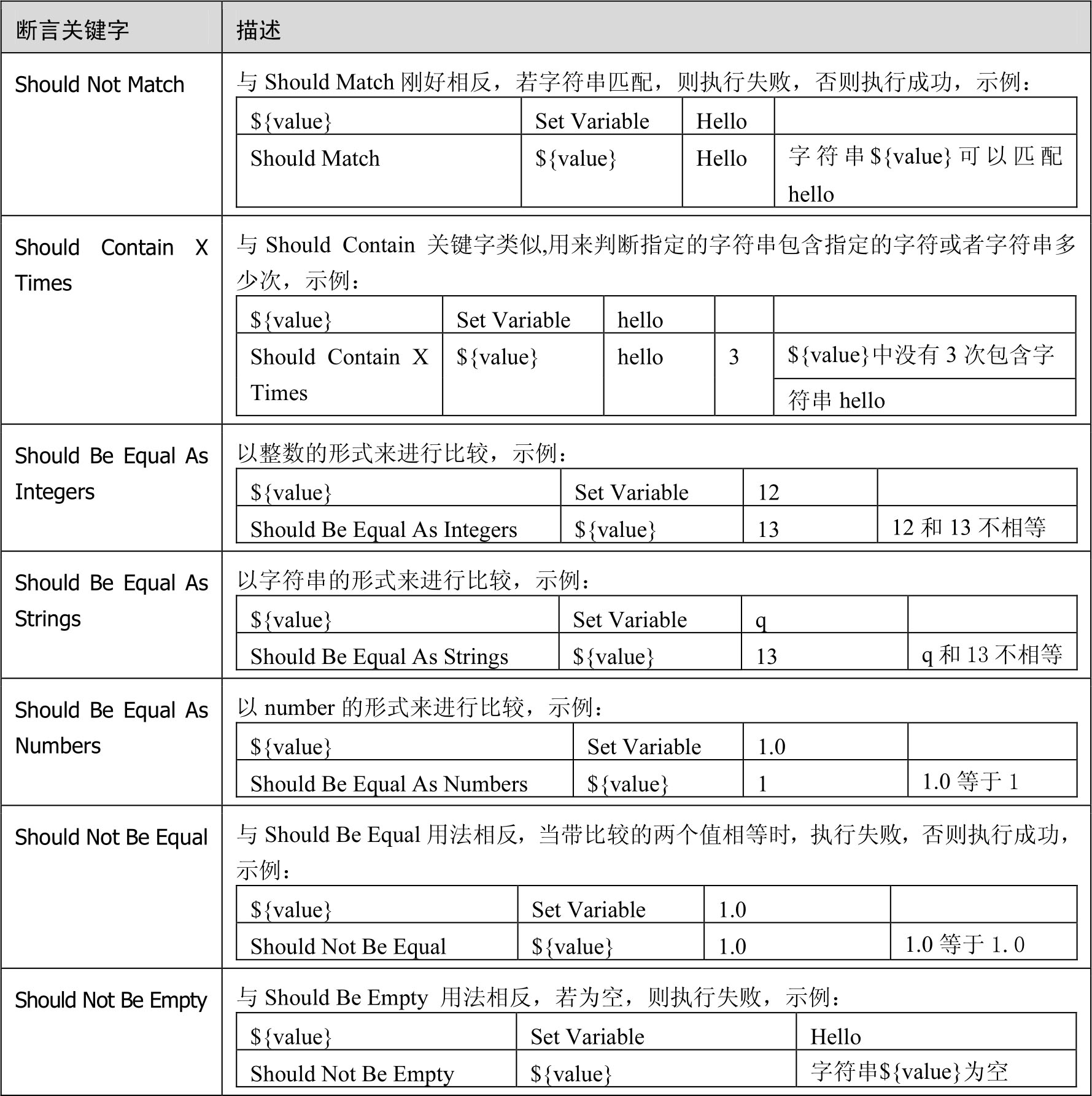 除了我们上面列出的关键字外,Robot Framework中还提供了大量其他的断言关键字,如表1-3-1所示。