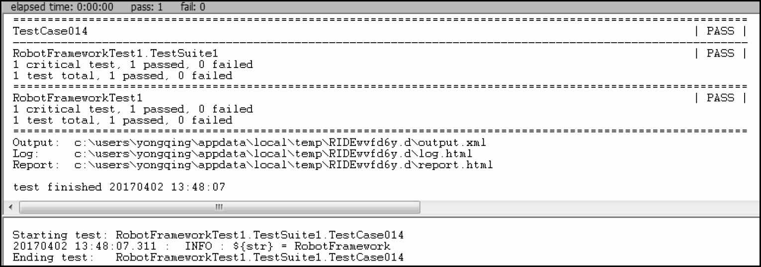 当我们将“Hello”字符串换成“work”后,再执行一下,会发现执行成功,因为RobotFramework是以work来结尾的,如图1-3-9所示。