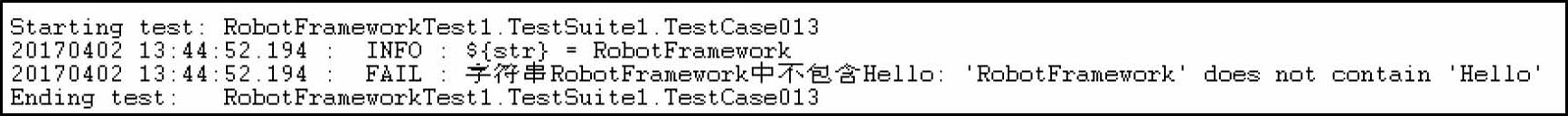 Should Contain 关键字用来判断某个字符串中是否包含了我们预期需要的字符或者字符串,例如我们将变量${str}的值设置为Robot Framework,使用Should Contain关键字来判断${str}是否包含“Hello”这个字符串。很明显,我们执行的结果肯定会判断失败,如图1-3-5所示。