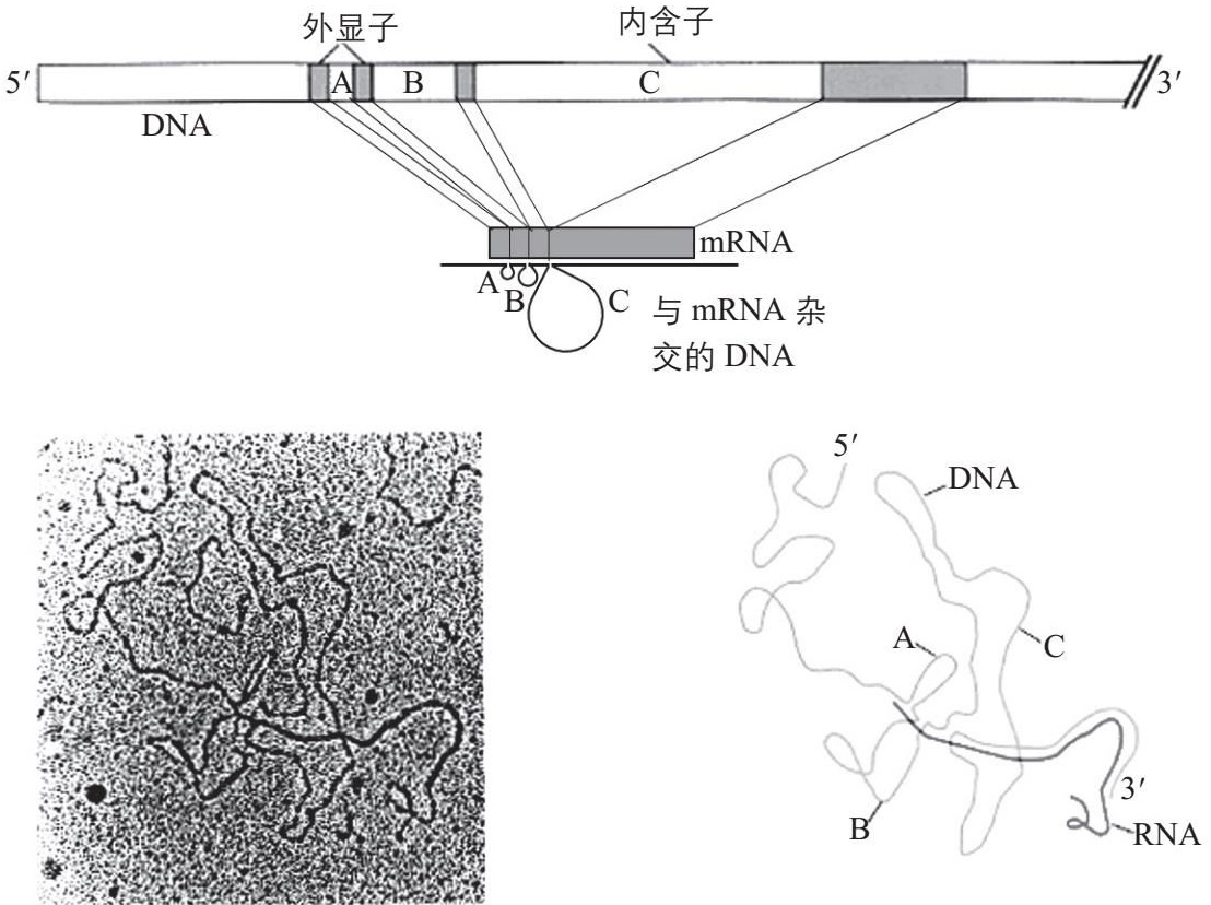 图3-4 基因中内含子的发现。腺病毒的六邻体基因中,为蛋白质编码的部分不是连续的,而是分为四段,它们之间被非编码的DNA序列隔开。mRNA的分子中,编码部分被连在一起,间隔序列则被“剪”掉。当用六邻体基因的DNA和对应的mRNA杂交时,mRNA只和编码的序列通过碱基配对结合,间隔序列则形成环。基因中为蛋白质编码的序列被称为外显子,间隔序列称为内含子。上为图示;左下为杂交结构的电镜照片;右下为照片的图解